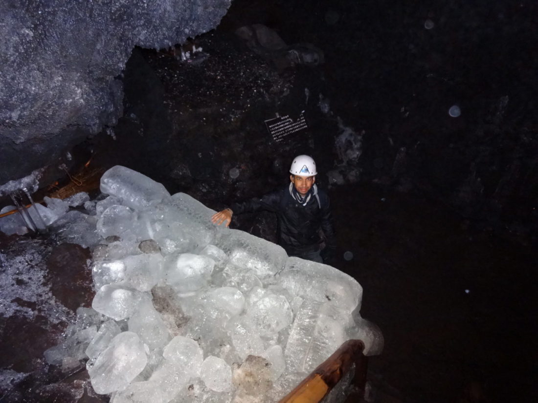 Aux alentours du Mont Fuji, il est possible d’explorer des grottes. Leur particularité est que l’air à l’intérieur est continuellement (et naturellement) maintenu à une température inférieure à 0°C, permettant ainsi des formations de de glace.